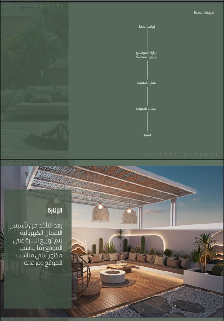 - تصميم وتنفيذ الإضاءة الخارجية والجلسات الخارجية.
